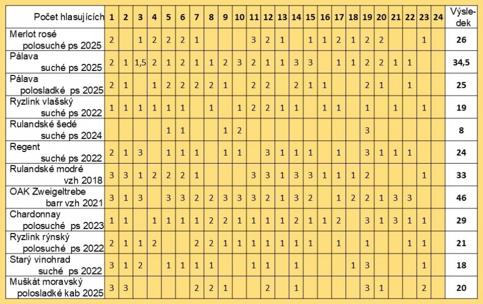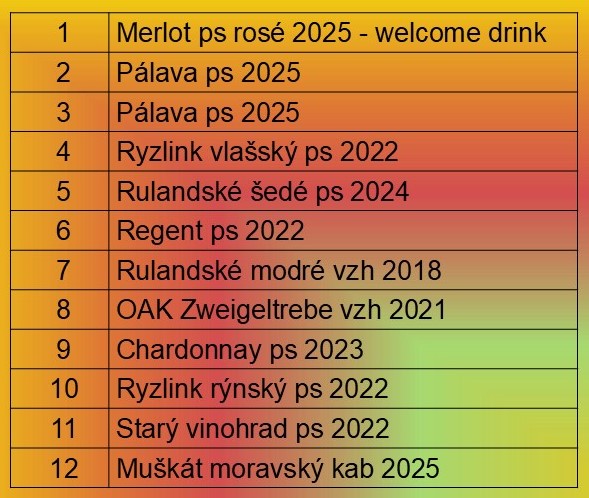Každé hodnocení je jen a jen subjetktivní. Nelze očekávat, že při pestrosti vín a chuťových preferencích jednotlivých účastníků lze dělat nějaké závěry. Pomalu si říkám, proč se jím vůbec zabývat... Snad abych těm, kteří se na tuto tabulku podívají ukázala, že je nejlepší si víno sám ochutnat... A k tomu je ovšem nutné zajít na ochutnávku, kde jsou všechna vína k mání, nebo i jen do vinotéky, protože u mě se dá mnohé víno ochutnat...