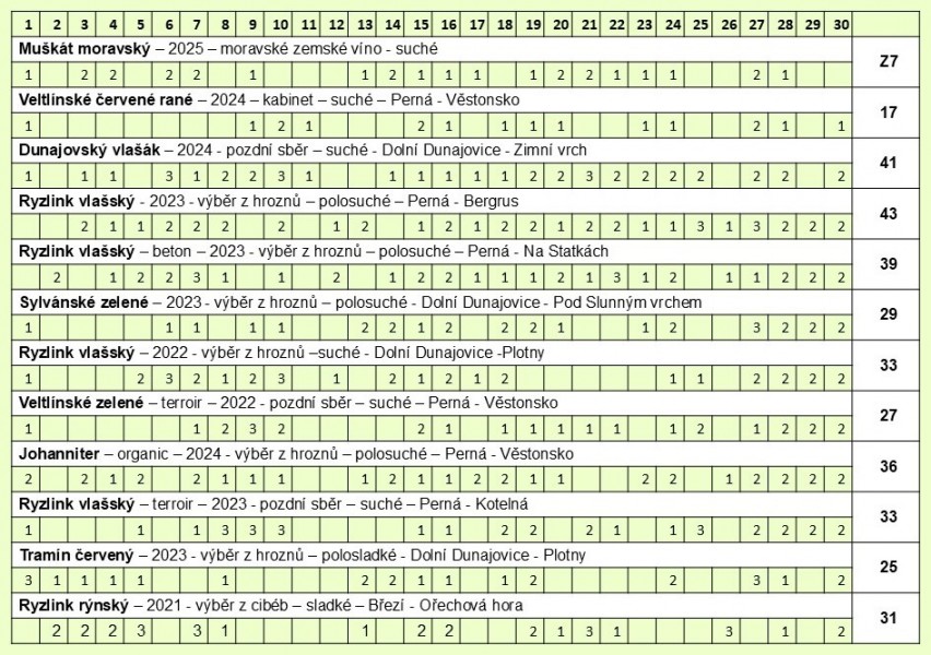 Ve výsledku jsme se sešli v počtu 34 degustátorů. Až do posledního vzorku byli zcela jistě všichni soustředěni na vyprávění Ondřeje Tichého i na vůně a chutě ve skleničce. Jako tradičně byl k degustačnímu lístku připojen lístek hlasovací. Kde jedna čárka znamená víno chutná. Dvě čárky je pro víno, které chutná moc a plot čárek - co s tím, jsou to ty 3 body v tabulce. Podařilo se mi vybrat 30 hodnocení a vytvořit tabulku byl docela oříšek.
